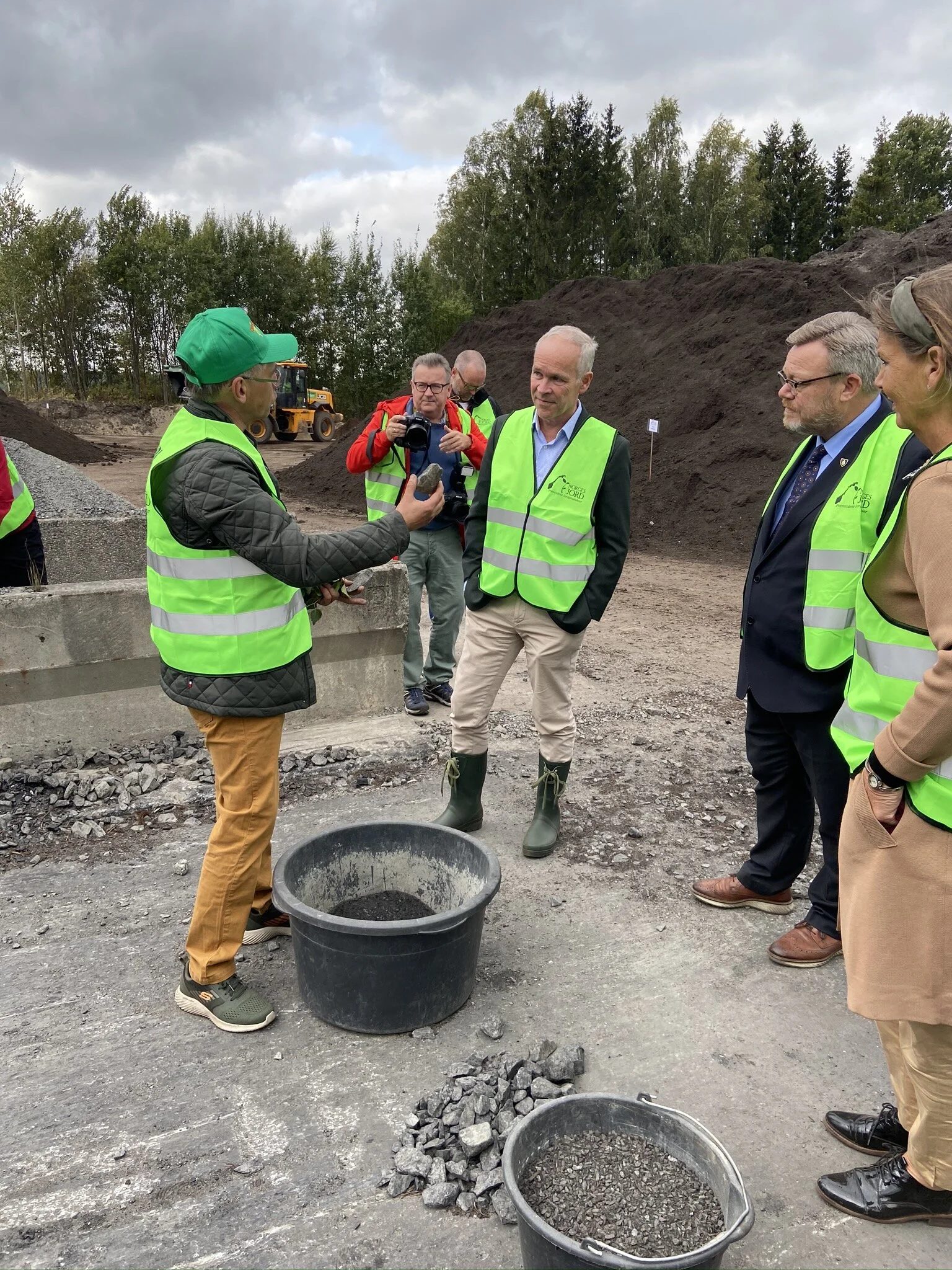 Helt på tampen av omvisningen fikk vi se og kjenne på det sorte gullet og en av “hemmelighetene” bak framtidens kompostblandinger- nemlig biokull. Tore og gjengen hans har over flere år utviklet 25 ulike jordblandinger, designet for ulike formål. Biokull er én av ingrediensene i det som er framtidens by-jord som kan skape mer klimarobuste byer med grønne lunger som vil ruste byen mot framtidige klimautfordringer med økt overvannsføring og perioder med tørke. Og det er nettopp derfor finansministeren tok turen til Mysen for å se på jord.